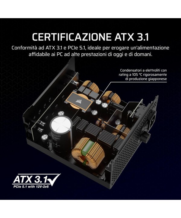 Alimentatore ATX 3.1Modulare con ventola silenziosa e modalità Zero RPMcavo 12VHPWR PCIe 5.1
