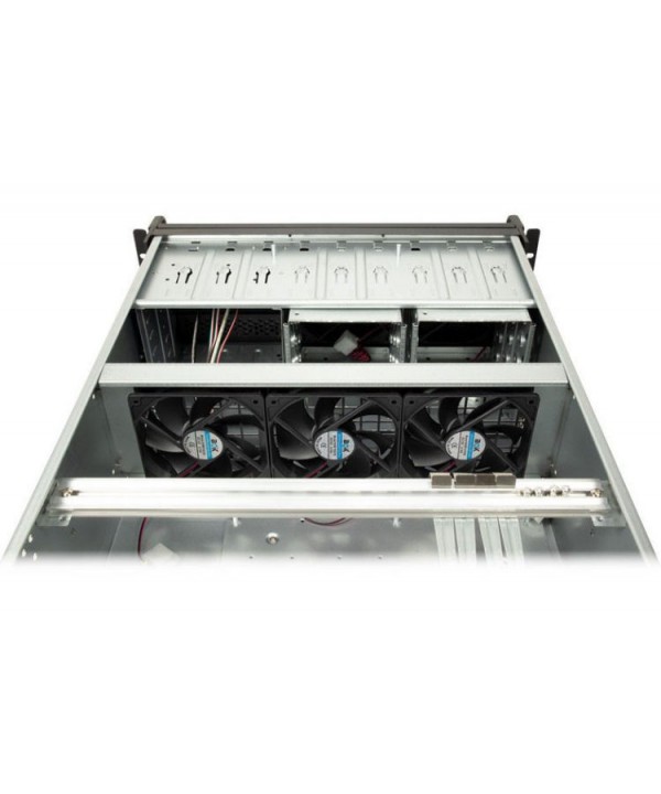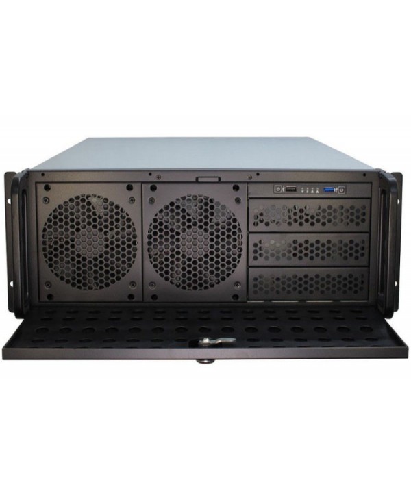 Server rack in formato 4U di Inter-Tech . La lunga profondità di installazione di 695 mm consente anche l'installazione di schede madri di grandi dimensioni (fino a EATX/SSI EEB). La robusta struttura in acciaio offre spazio per un massimo di dieci supporti dati da 3,5 pollici. Un totale di sette ventole sono già preinstallate e lo sportello anteriore bloccabile offre un filtro antipolvere rimovibile.
