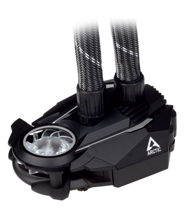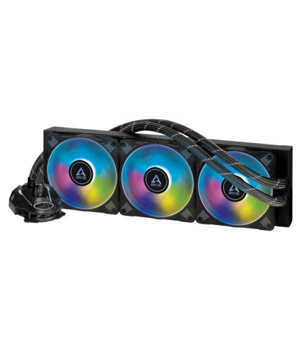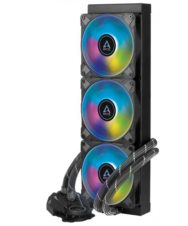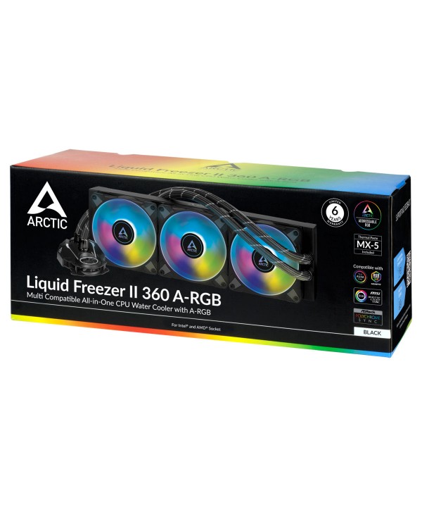 L' Arctic Liquid Freezer II A-RGB Black 360 è un dispositivo di raffreddamento a liquido all-in-one per CPU . Tre ventole da 120 mm con illuminazione RGB indirizzabile e un radiatore di dimensioni adeguate garantiscono un potenziale di raffreddamento decente e colori eleganti. Il refrigeratore d'acqua AiO si adatta a varie costruzioni grazie al suo semplice design nero con tubi completamente rivestiti. I cavi per l'alimentazione della pompa, che è integrato nella piastra di base, corrono all'interno dell'alloggiamento del tubo, in modo da preservare un aspetto sottile. Grazie alle dimensioni compatte della pompa, possono essere installati anche moduli RAM con dissipatori di calore di grandi dimensioni e non sono bloccati.