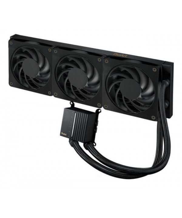 Dissipatore a liquido all-in-one per CPU ProArt LC 360 con indicatore di stato del sistema illuminato e tre ventole Alphacool Apex Stealth Metal Power nere opache.